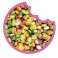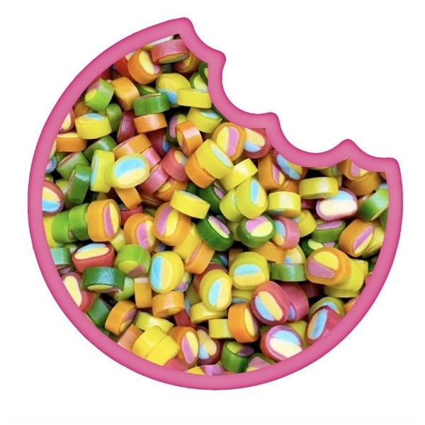 Sucre, sirop de glucose, farine de BLE, amidon de BLE, graisse de palme, émulsifiants : mono- et diglycérides d'acides gras, esters citriques de mono- et diglycérides d'acides gras, dextrose , acidifiant : acide citrique, gélifiant : carraghénane, correcteur d'acidité : citrate trisodique, huile de tournesol, arôme, concentrés de fruits et de plantes : spiruline, radis, cassis, pomme, sureau, aronia, raisin, extrait de sureau, colorants : curcumine, complexes cuivriques de chlorophyllines, agents d'enrobage : cire d'abeille blanche et jaune.