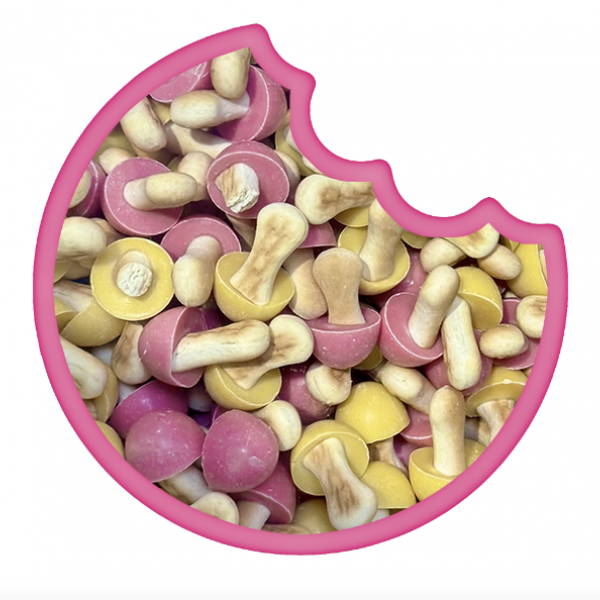 Enrobage 60 % (saveur fraise & banane) : sucre, huile de palme hydrogénée, lactosérum (LAIT) en poudre, lait écrémé en poudre, colorants (bêta-carotène, carmin), émulsifiant (lécithine de colza), arômes (fraise, banane, vanilline).