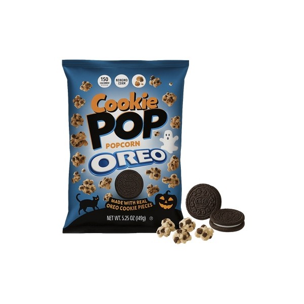 Enrobage de confiserie (sucre, huile végétale (huile de palmiste et huile de palmiste hydrogénée), solides de LAIT entier, poudre de lactosérum, solides de LAIT écrémé en poudre, colorant artificiel (E110), lécithine de SOJA (émulsifiant), sel, arôme artificiel), pop-corn, biscuits Oreo (farine enrichie non blanchie (farine de BLE, niacine, fer réduit, mononitrate de thiamine (vitamine B1), riboflavine (vitamine B2), acide folique), sucre, huile de palme et/ou de canola, cacao (traité à l'alcali), sucre inverti, poudre à lever (bicarbonate de soude et/ou phosphate de calcium), lécithine de SOJA, sel, chocolat, arôme naturel), huile de tournesol, sucre de canne, arôme artificiel.