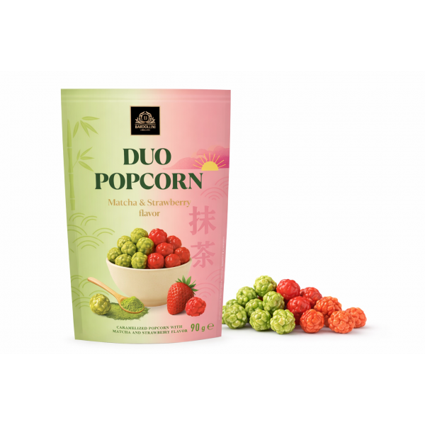 Pop Corn Duo Matcha & Strawberry 90 g : un popcorn croustillant caramélisé qui associe deux saveurs gourmandes, le matcha japonais aux notes végétales et la fraise douce et fruitée. Un mélange original et coloré idéal pour les amateurs de snacks premium et de saveurs asiatiques.