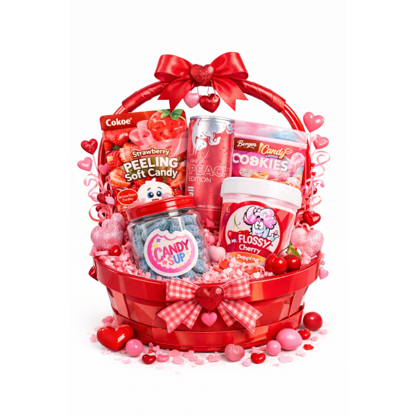 Craquez pour notre Panier Spécial Saint-Valentin : Red Bull Peach, cookies barbe à papa pétillants, bonbons peeling strawberry, tétines acidulées et barbe à papa acidulée cerise. Un coffret gourmand, original et parfait pour surprendre (photo non contractuelle)